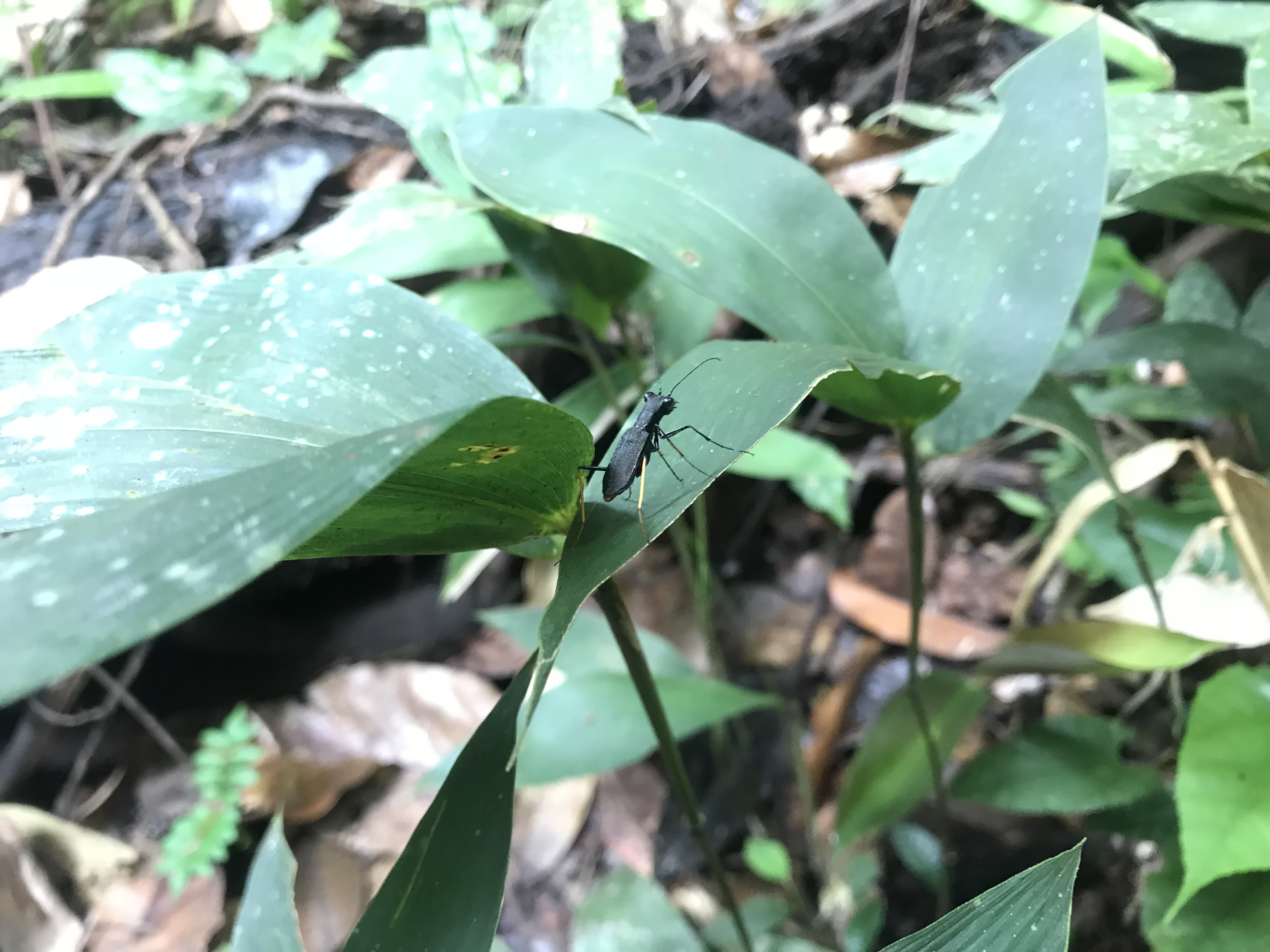 The fairly common tiger beetle species Odontocheila cayennensis flying from the trail to lower vegetation to hide (Credit: Emmanuel Toussaint)