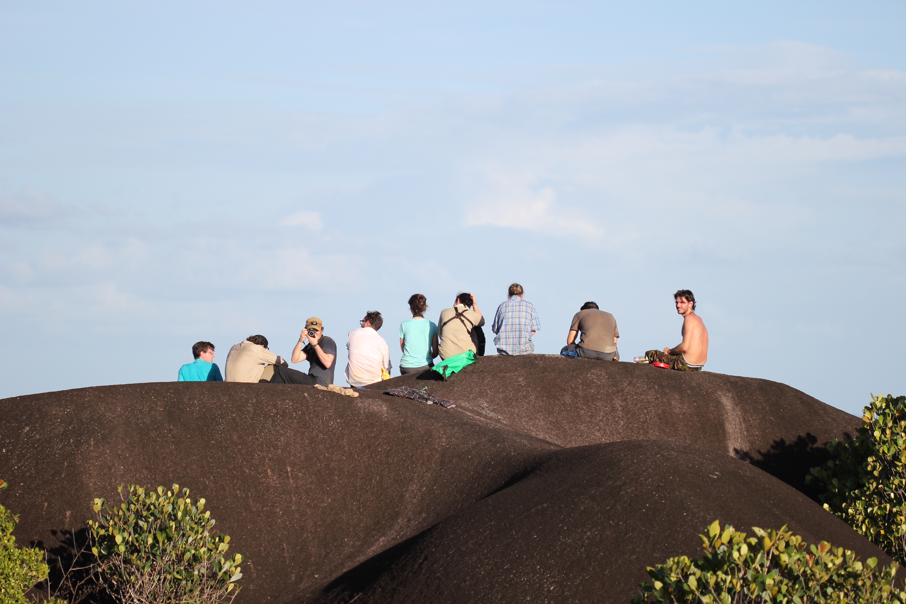 The entire team and friends on the top of the rock outcrops above the CNRS Inselberg station a couple of hours of rainforest hiking from Pararé (Credit: Emmanuel Toussaint)