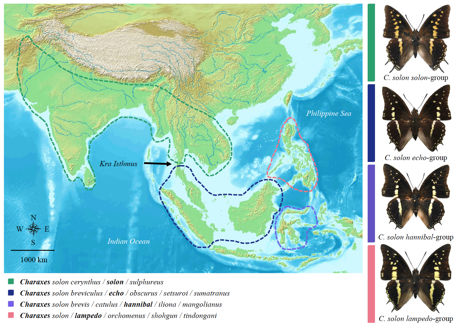 - 11/ 2018 – Our study on the evolution of the Charaxes solon complex is just out in the Biological Journal of the Linnean Society. What was suspected for decades is supported by different lines of evidence. Specifically, each major biogeographical group is a valid species. We raise back to species status three subspecies: Charaxes echo from the Greater Sunda Islands, Charaxes hannibal from Wallacea and Charaxes lampedo from the Philippines. An interesting development not only for the taxonomy of the group but also for the biogeography of the genus as a whole since this is the third Charaxes lineage that colonized South East Asia from Africa.