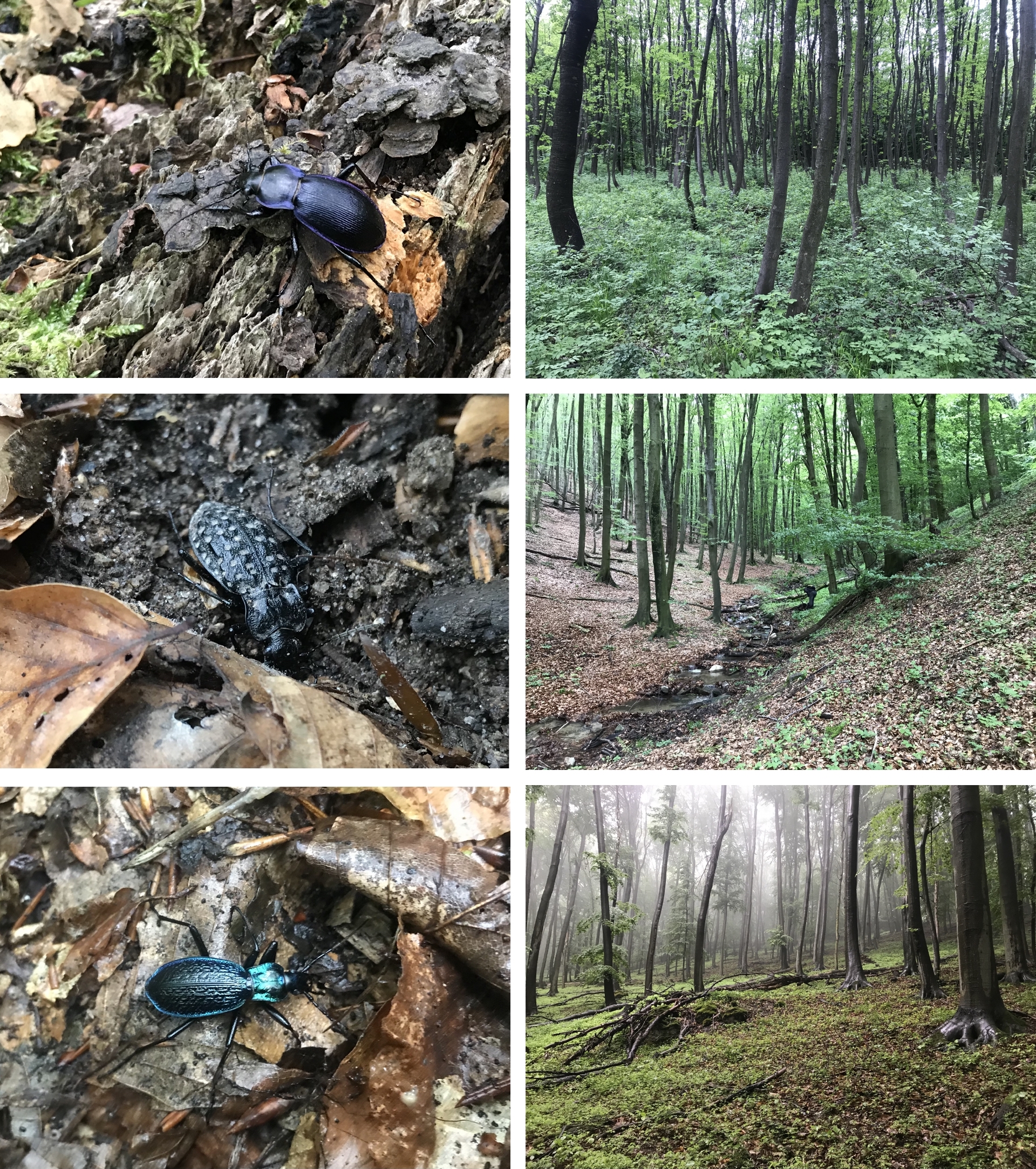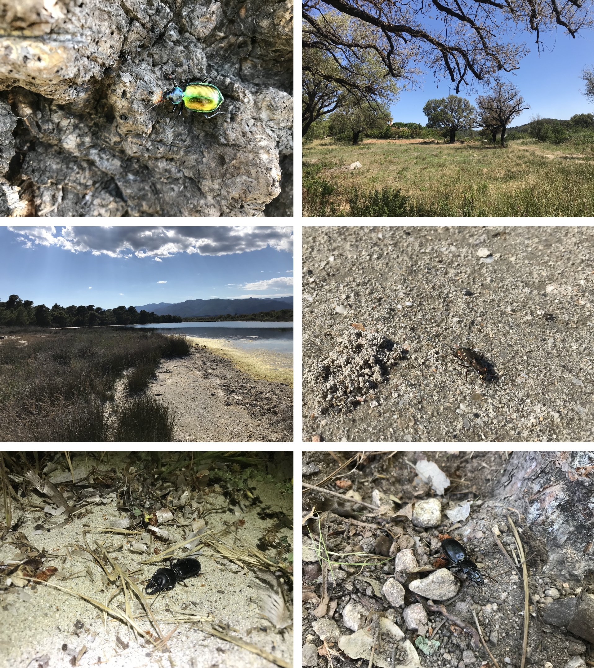 Top and bottom are classical habitats for both species, Cicindela gallica (middle left) and Carabus pedemontanus (middle right)