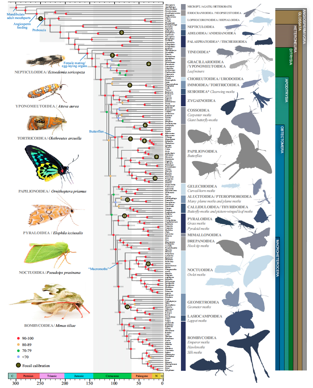 The new fossil-based dated phylogenomic framework for Lepidoptera based on an analysis of transcriptomic data. (Kawahara et al. 2019 / PNAS)
