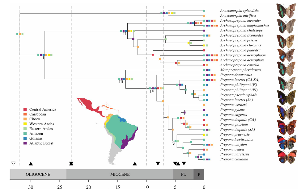 Historical biogeography of Preponini butterflies showing a complex pattern of diversification due to the widespread ragnes of several species in this tribe. (Ortiz-Acevedo et al. 2020 / Ecol Evol)
