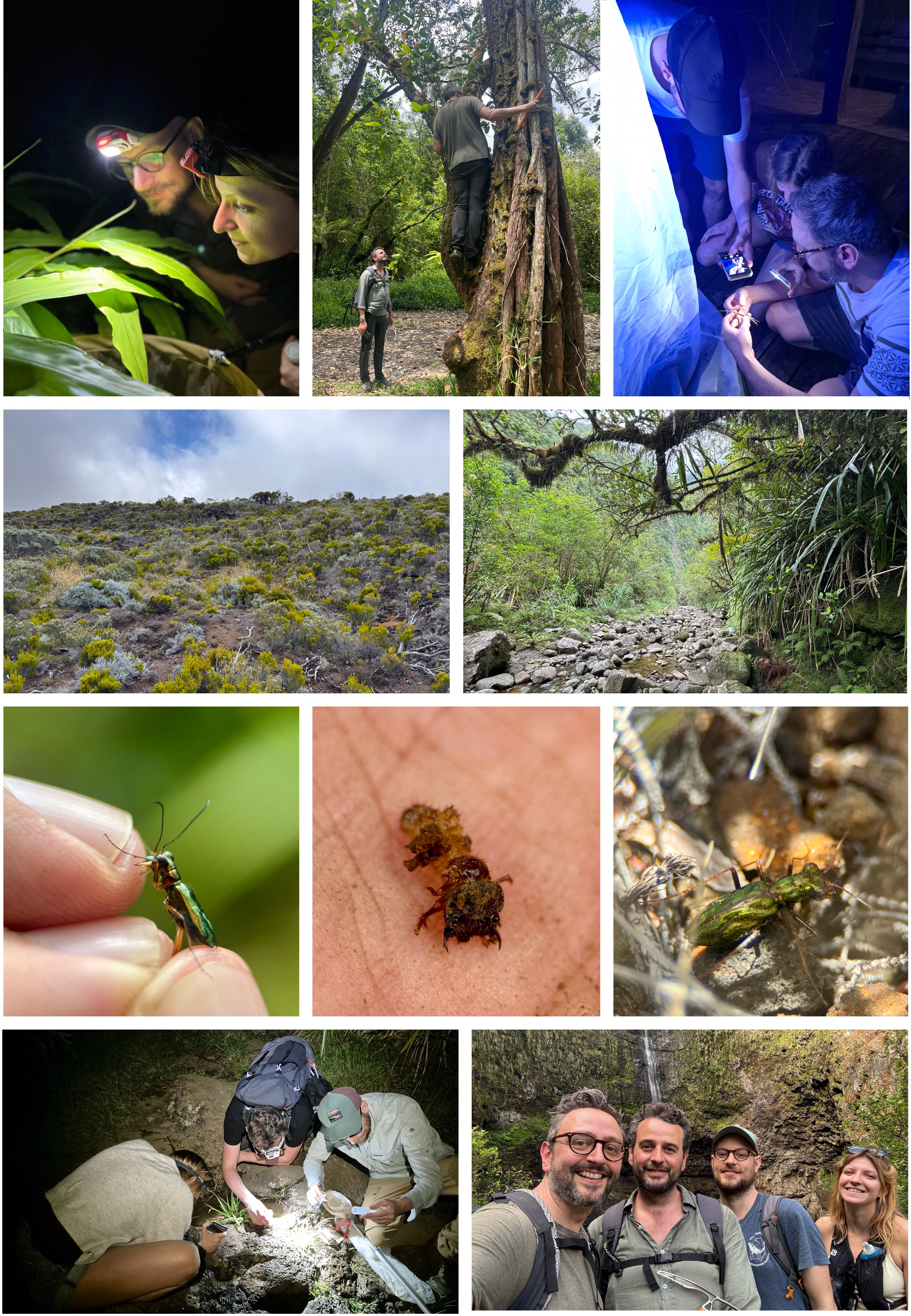 Fieldwork expedition on La Réunion island – From top to bottom and left to right: Night collecting near Cascade du Biberon, Looking for Megalomma pierreorum larval burrows in Eucalyptus trunks, Light-trapping in La Plaine-des-Palmistes, La Plaine des Remparts habitat at 2200m, Tropical stream near Cascade du Bras d’Anette, The rare Megalomma fulgens in Forêt de Bébour, Larva of Diastrophella pauliani at the Coteau Kervéguen on the slopes of the Piton des Neiges ca. 2200m, Adult of Diastrophella pauliani at the Plaine des Remparts ca. 2200m, Night observation of aquatic beetles at the Cascade du Biberon, The team (Manu, Laurent, Jérémy and Agata) on the Takamaka waterfall trail (Credit: Emmanuel Toussaint)